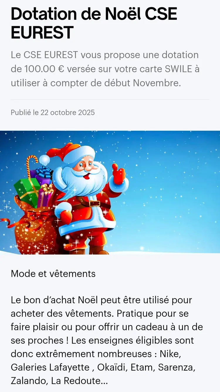 Le CSE Eurest offre à tous les salariés du périmètre présent au 31 Octobre 2023 des chèques cadeaux d'une valeur de 100 € pour Noël 2023.