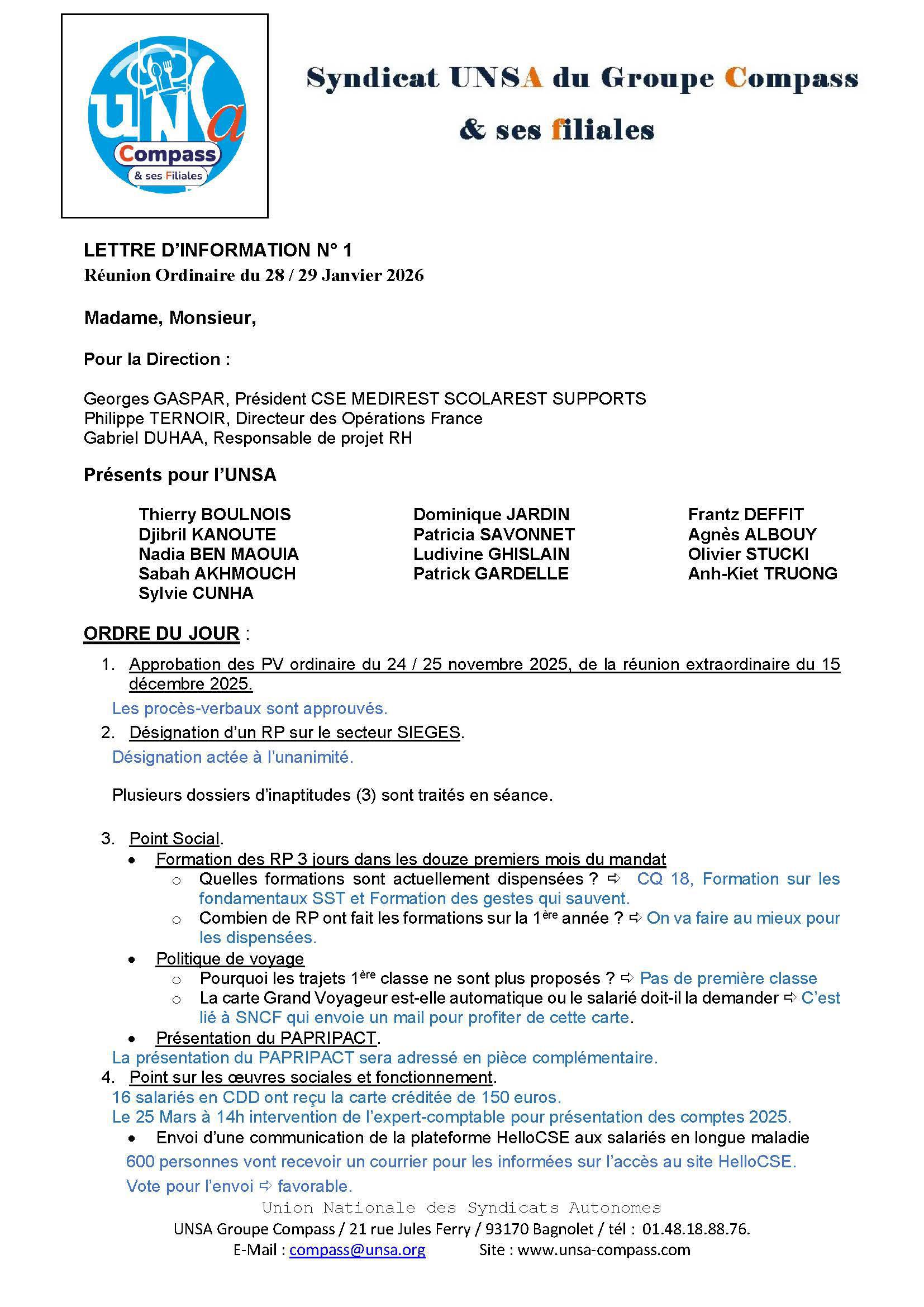 LETTRE D'informations du 28/29 Janvier 2026 CSE Médirest/Scolarest